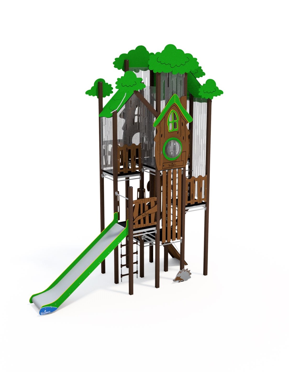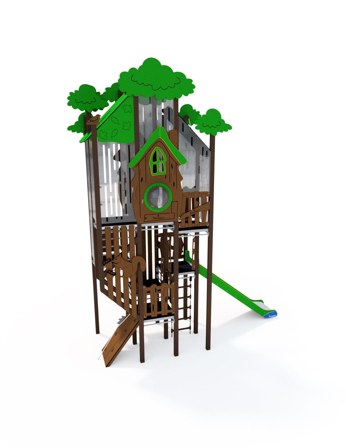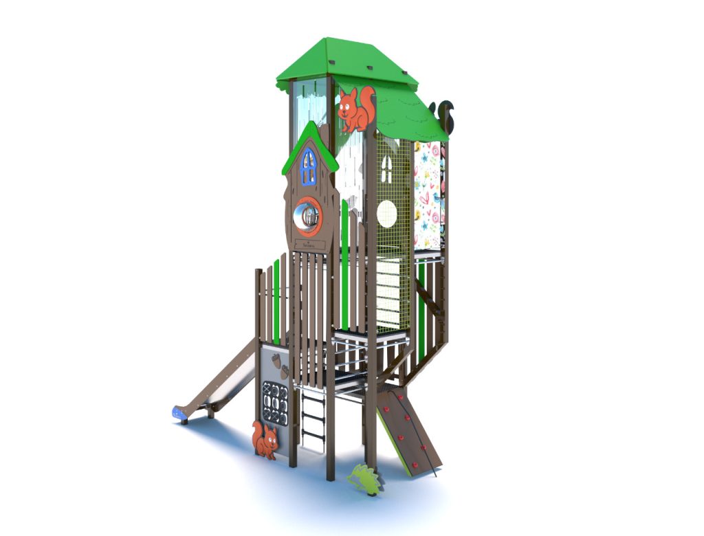 A gyerekek már messziről felfedezik a fák között rejtőző toronyban a kis „mókuslakot”, ahonnan csúszdán száguldhatnak lefelé, vagy kötélmászón és létrán küzdhetik fel magukat a csúcsra. Minden részlet arra hivatott, hogy ösztönözze az aktív mozgást, a kreativitást és a közös játékélményt.