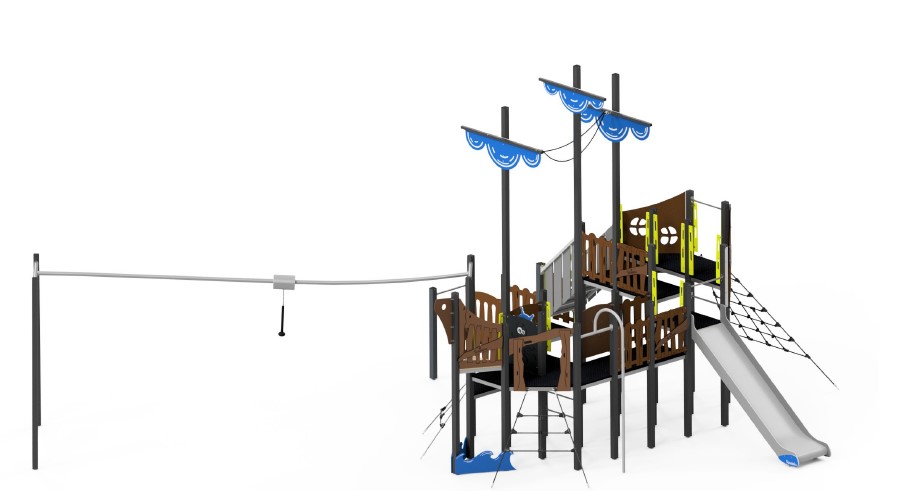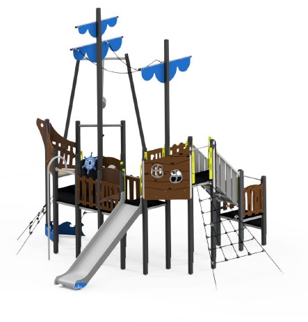 A P11172 Tengeri csatahajó kötélpályával egy valódi élménypark a gyerekek számára, amely nem csupán játszótéri eszköz, hanem egy komplett kalandtér. A hajós tematikájú kialakítás azonnal megragadja a gyerekek fantáziáját: kapitányok, matrózok és felfedezők vehetik birtokba a fedélzetet, miközben észrevétlenül fejlődik a mozgáskoordinációjuk, egyensúlyérzékük és bátorságuk.